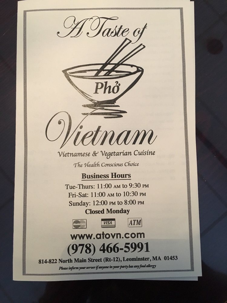 Introducing the menu at A Taste of Vietnam, a Vietnamese restaurant in Leominster, MA, offers a diverse range of options including seafood pho, chicken pho, beef pho, pad Thai, vermicelli with extra vegetables, fresh rolls, crispy eggplant appetizers, lemon chicken, and more. The restaurant provides takeout, reservations, delivery, and vegan options, making it suitable for various dietary preferences. Customers praise the flavorful broth, crunchy veggies, and accommodating staff. The warm and quiet atmosphere inside adds to the dining experience, while the outdoor seating is perfect for enjoying the meal al fresco. With a focus on accommodating dietary restrictions and offering low-sodium options, A Taste of Vietnam stands out as a go-to spot for authentic Vietnamese cuisine in Central MA.